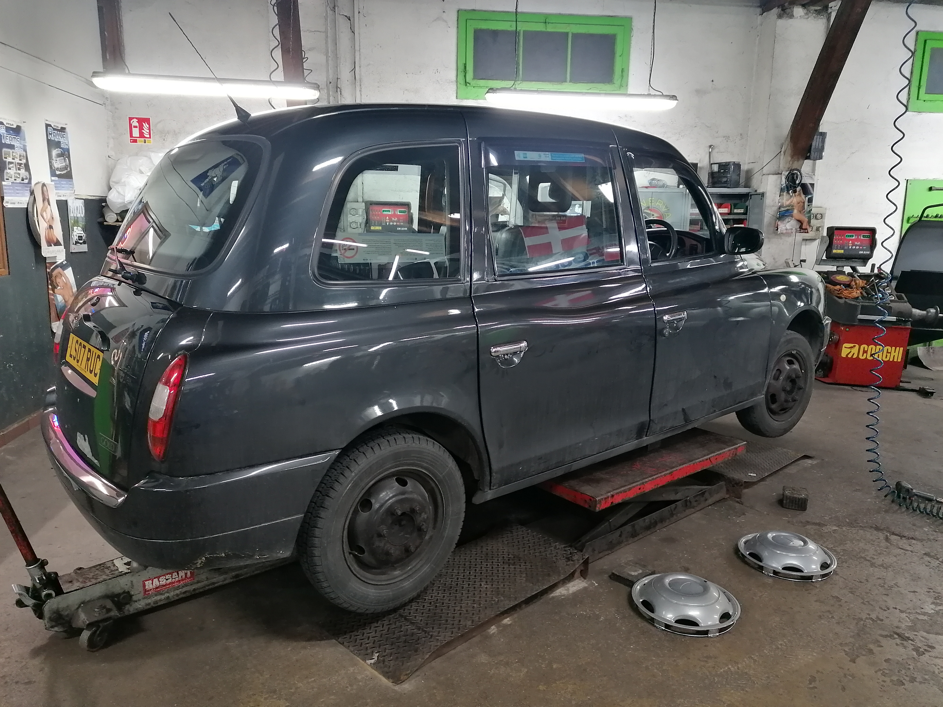 Et voil? le tx4 sur son pont pour ses pneus neige ! Et la neige tombe dehors...